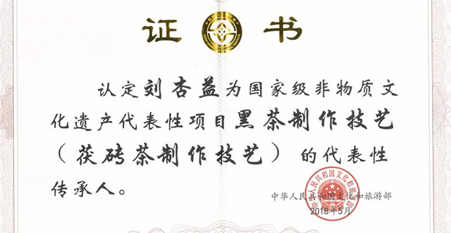 10月9日,益陽(yáng)市非物質(zhì)文化遺產(chǎn)項(xiàng)目國(guó)家級(jí)省級(jí)代表性傳承人證書(shū)頒發(fā)儀式在益陽(yáng)舉行,公司副總經(jīng)理劉杏益榮獲第五批國(guó)家級(jí)非物質(zhì)文化遺產(chǎn)代表性項(xiàng)目代表性傳承人、公司質(zhì)管部經(jīng)理黃燕榮獲第四批省級(jí)非物質(zhì)文化遺產(chǎn)代表性項(xiàng)目代表性傳承人。益陽(yáng)茯磚茶制作技藝因其悠久的歷史文化、精湛的傳統(tǒng)技藝、獨(dú)特的品質(zhì)要求被列入國(guó)家級(jí)非物質(zhì)文化遺產(chǎn)保護(hù)名錄。