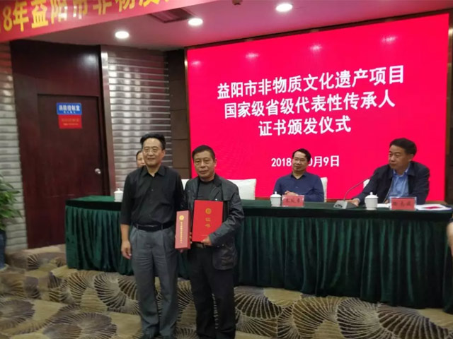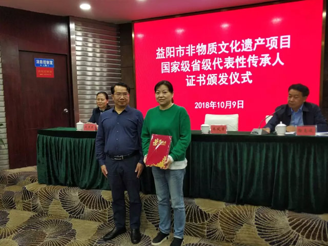 圖為湖南省文化廳非物質(zhì)文化遺產(chǎn)項(xiàng)目處竇雪松處長(zhǎng)為劉杏益頒發(fā)證書(shū)