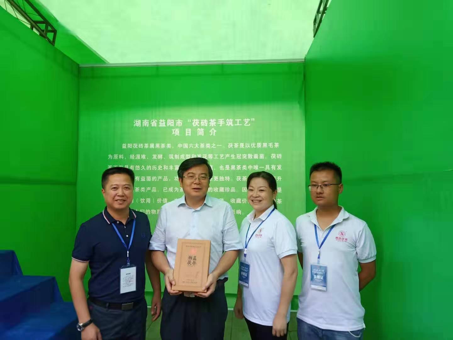 圖為湖南省文化和旅游廳副廳長、省文物局局長陳遠平( 左二)蒞臨湘益茯茶展位指導工作,茯磚茶非遺技藝傳承人徐迪軍、黃燕陪同。