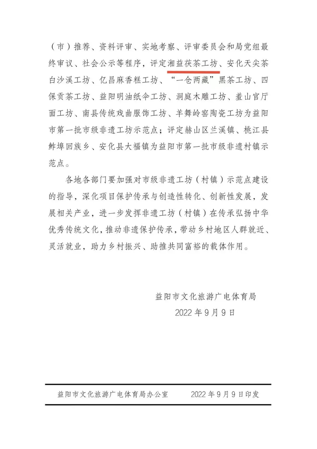 為深入貫徹中共中央辦公廳、國務院辦公廳《關于進一步加強非物質文化遺產(chǎn)保護工作的意見》有關精神,市文化旅游廣電體育局在全市開展非遺工坊、非遺村鎮(zhèn)、非遺街區(qū)示范點建設工作,經(jīng)區(qū)縣(市)推薦、資料評審、實地考察、評審委員會和局黨組最終審議、社會公示等程序,評定湘益茯茶工坊、安化天尖茶白沙溪工坊、億昌麻香糕工坊、“一倉兩藏”黑茶工坊、四保貢茶工坊、益陽明油紙傘工坊、洞庭木雕工坊、羞山官廳面工坊、南縣傳統(tǒng)戲曲服飾工坊、羊舞嶺窯陶瓷工坊為益陽市第一批市級非遺工坊示范點;評定赫山區(qū)蘭溪鎮(zhèn)、桃江縣鲊埠回族鄉(xiāng)、安化縣大福鎮(zhèn)為益陽市第一批市級非遺村鎮(zhèn)示范點。