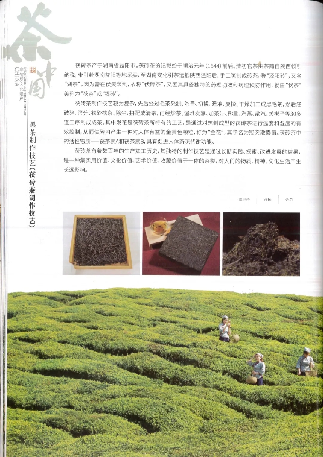 湖南黑茶是指采用湖南雪峰山脈泛區(qū)域茶葉為原料,在經(jīng)殺青、揉捻、渥堆、(復(fù)揉)、干燥等幾道工藝加工而成黑毛茶的基礎(chǔ)上再精制加工而成的黑茶成品。其品類包括“四磚三尖一卷”,即茯磚茶、黑磚茶、青磚茶、花卷茶、天(貢、生)尖茶和千兩茶。其中尤以富含“金花”(冠突散蘘菌)的茯磚茶獨(dú)具特色。