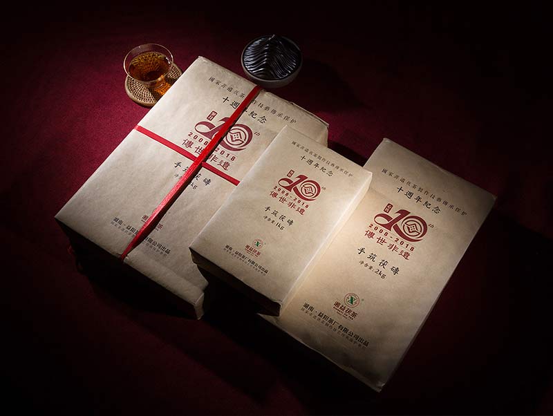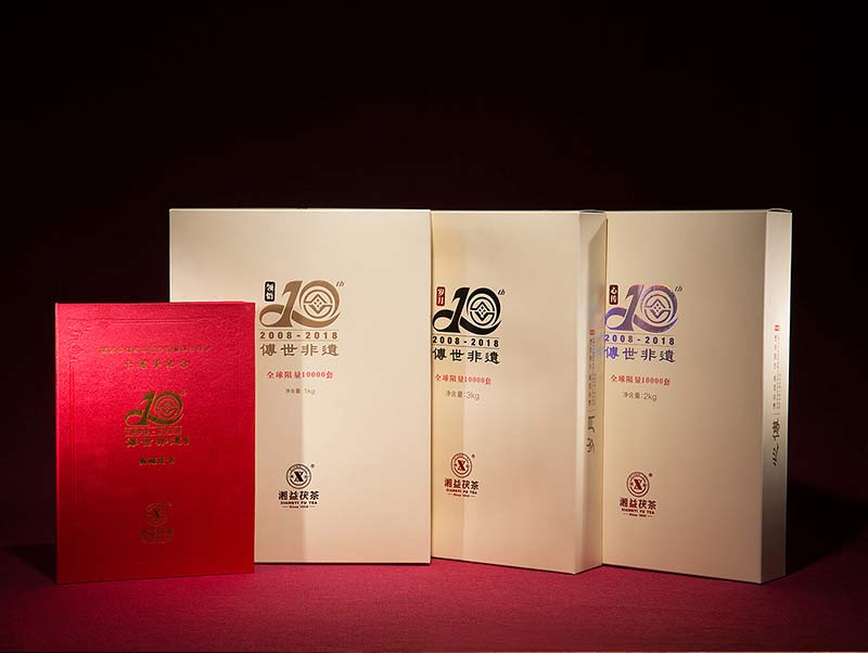 此款組合紀(jì)念茶限量收藏禮盒套裝為隆重紀(jì)念茯磚茶制作技藝列入國家非物質(zhì)文化遺產(chǎn)保護名錄十周年包含“歲月3kg”、“心傳2kg”、“領(lǐng)悟1kg”三塊精制手筑茯磚,每套均有劉杏益大師親筆簽名,并配備有獨立收藏編號的典藏證書,共10000套,收藏品飲價值皆宜。